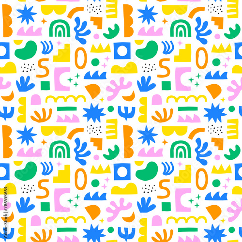 Abstract organic shape seamless pattern with colorful geometric doodles. Flat cartoon background, simple random shapes in bright childish colors.