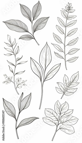 abstract outline hand white leaves floral drawn botanic background set plant art pencil sketch olated line branch illustration set tree branch floral outline botanic line hand draw plant vignetting