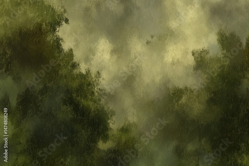 Abstract painting, muted greens and browns, depicting foliage and mist. Dense, textured landscape