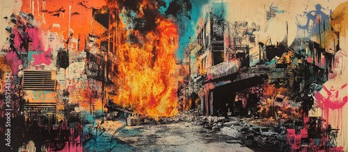Abstract painting of a city burning with bright orange and yellow flames, depicting destruction, conflict, and chaos.