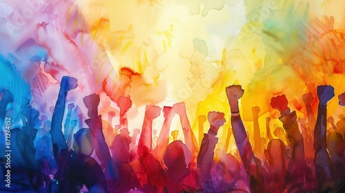 Abstract painting of a crowd with raised fists, symbolizing unity, celebration, and hope. Vibrant colors and dynamic composition.