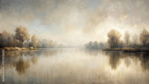 Abstract painting of serene lake in neutral beige and grey tones, with a soft and blurry appearance , abstract, painting, lake, serene