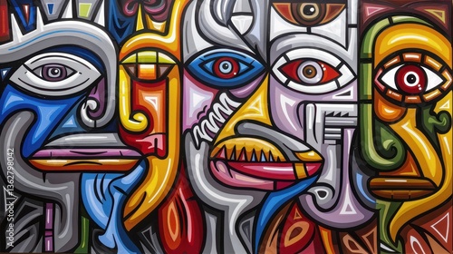 Abstract painting of three faces with vibrant colors and expressive brushstrokes