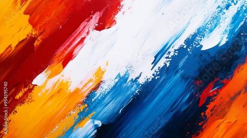 Abstract Painting with Diagonal Strokes in Red, Orange, White, Blue, and Black