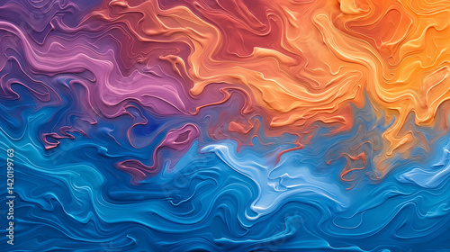 Abstract painting with fluid swirls of blue, orange, and purple creating a dynamic and textured effect