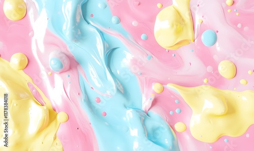 Abstract pastel pink, blue, yellow paint swirls and bubbles.