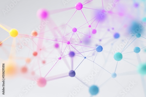 Abstract pastel spheres interconnected by thin, translucent lines forming a complex network against a blurred white background