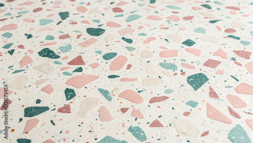 Abstract pastel terrazzo background with scattered organic stone shapes, creating a stylish and trendy decorative texture for various design applications.