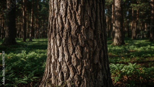 Abstract pattern of a sliced pine log surrounded by lush greenery