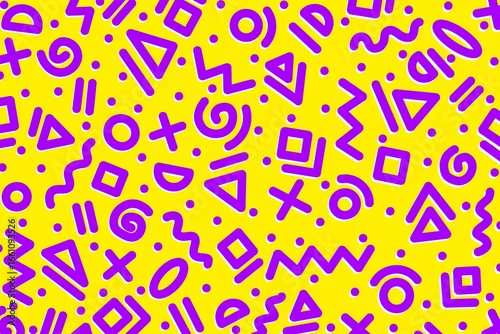 Abstract pattern with geometric shapes, wave, lines, circle, triangle, squares, confetti, dots, stripes in purple on yellow background. Memphis style or 80s & 90s retro aesthetic. Fun. Colorful