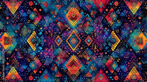 Abstract pattern with vibrant geometric shapes, intricate and seamless design, dynamic and eye-catching