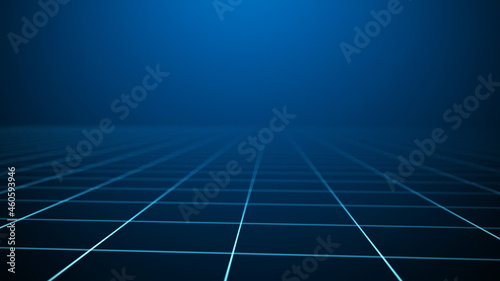 Abstract perspective grid. Digital retro background. Wireframe cyber landscape on blue background. 3d rendering.
