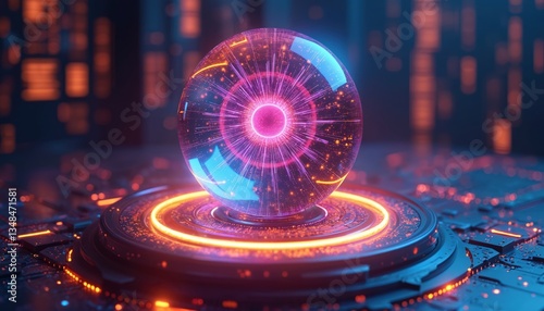 Abstract photo, quantum computing with AI for cybersecurity. Glowing sphere on circuit board advanced tech, data processing, network defense. Futuristic tech design. Cyber threat detection, defense.