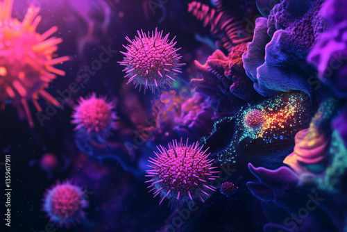 Abstract pink and purple virus, disease, microbiology, medicine, bacteria, infection under a microscope.