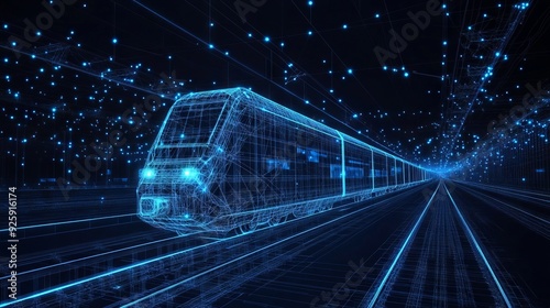 Abstract polygonal 3d wireframe of modern train at railway station or metro. Digital vector mesh looks like starry sky. Rapid transit system, transportation, railway logistics concept in dark blue