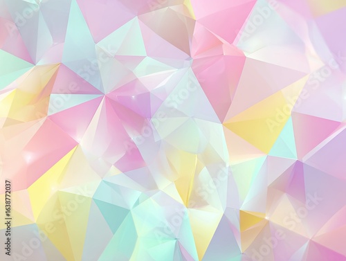 Abstract polygonal background of pastel colors. Soft, blended hues of pink, purple, yellow, and mint green create a gentle, cheerful design.