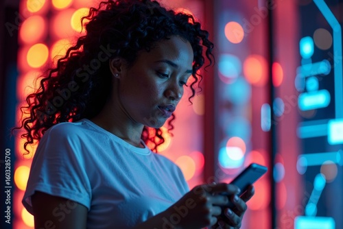Abstract Portrait: African American Individual Engaged with Mobile Security System, featuring Vibrant Imagery and Digital Elements