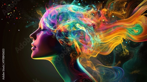 Abstract Portrait of a Woman with Colorful Energy Flowing from Her Head