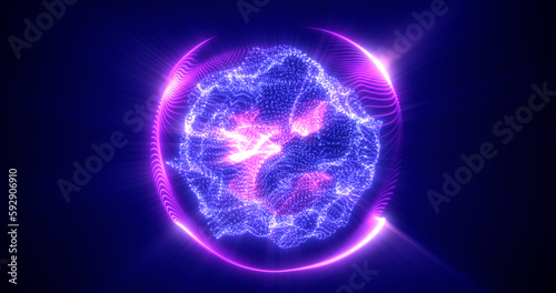 Abstract purple energy sphere from particles and waves of magical glowing on a dark background