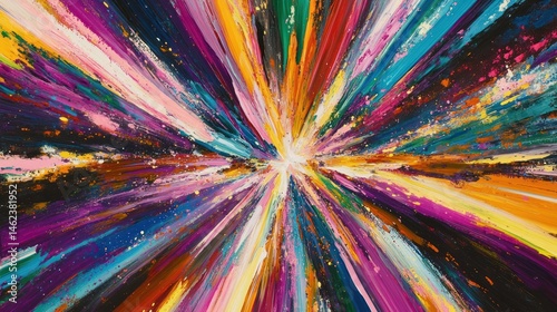 Abstract radial burst of vibrant colors, with streaks and splashes radiating outward from a central point.