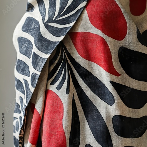 Abstract Red and Black Leaf Pattern on Beige Linen Fabric