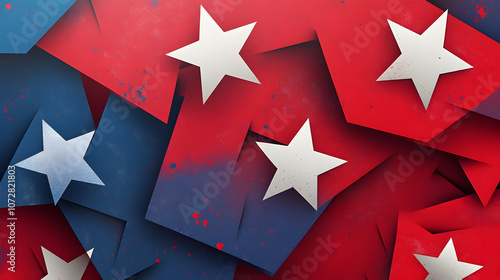 Abstract red and blue geometric shapes with white star motifs and artistic design.
