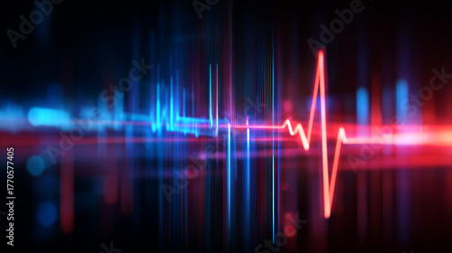 Abstract red and blue waveform with vertical lines on a dark background with reflections