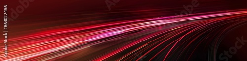 Abstract red lines depict the speed of the road in red. Red light trails on a dark background, with a high speed and fast motion blur effect.