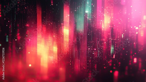 Abstract red, pink, and green glitch art background with geometric shapes and pixelated textures evokes retro video games.