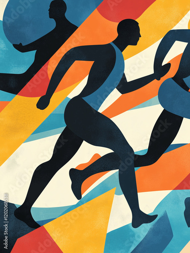 Abstract representation of a dynamic workout plan featuring running figures in vibrant colors and bold shapes