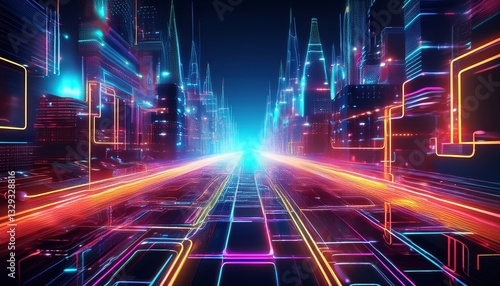Abstract representation of a sci-fi city grid, featuring vibrant neon pathways and geometric shapes that evoke a futuristic, high-tech urban landscape.