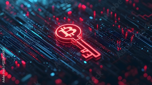 Abstract representation of financial independence and growth with a glowing bitcoin key unlocking a sleek futuristic vault filled with digital coins and data streams