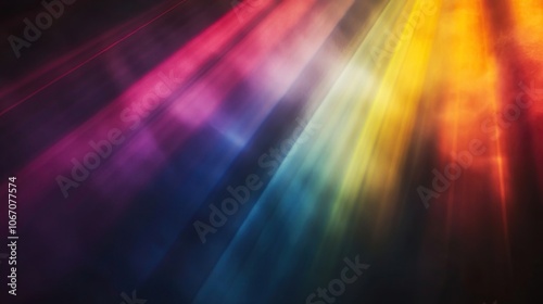 Abstract representation of rainbow-colored light rays on a black background, creating a vibrant and dynamic visual effect, perfect for illustrations with ample copy space.