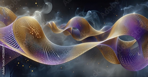 Abstract ribbons flow, golden purple hues blend. Smoke swirls, creating dynamic light effects. Digital art, vibrant texture.