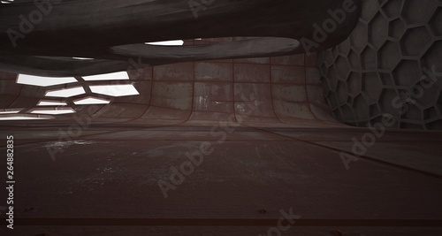 Abstract room interior of sheets rusted metal . Architectural background. 3D illustration and rendering