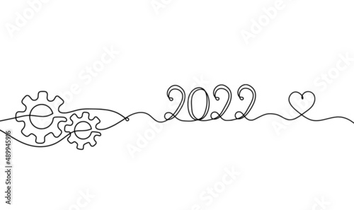 Abstract round metal gears wheels with 2022 as line drawing on white background. Vector