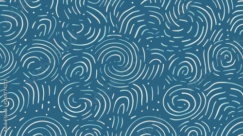 Abstract seamless pattern with bright spirals, glowing circular loops, and curved lines on deep blue background, creating dynamic and modern design