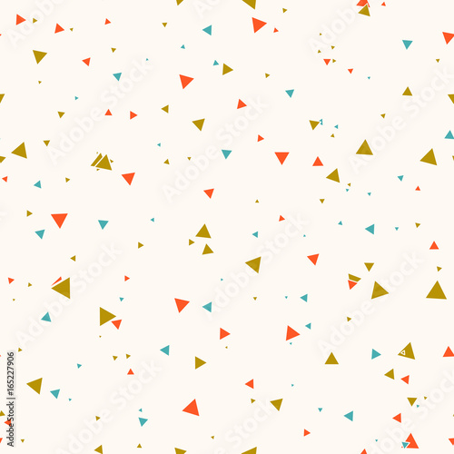 Abstract seamless pattern with colorful blue, gold, orange chaotic small triangles on beige background. Infinity geometric card. Vector illustration.