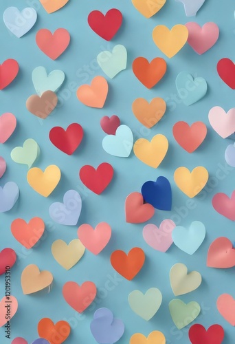 Abstract seamless pattern with multicolored hearts on a soft blue background, celebration, Valentine's Day, backdrop