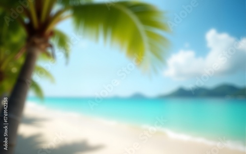 Abstract seascape with palm tree, tropical beach background. blur bokeh light of calm sea and sky. summer vacation background concept. High quality