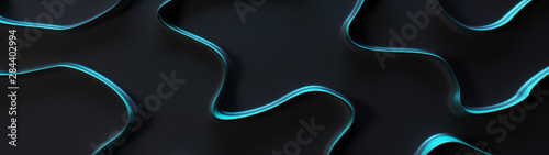 Abstract shapes design on reflective dark background with dark blue green 3d curved lines top view close up panoramic.
