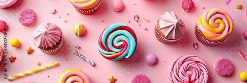 Abstract shapes of cute sweets like cupcakes, lollipops, and candies on a pastel background