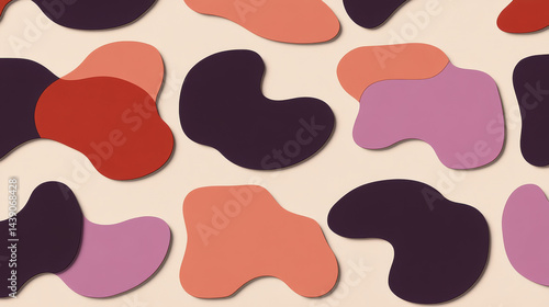 Abstract shapes various colors create dynamic and modern background, featuring organic forms shades of red, purple, and peach against soft beige backdrop. This design evokes sense of creativity