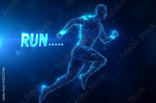 Abstract silhouette of a running man, "RUN..." written on a blue background
