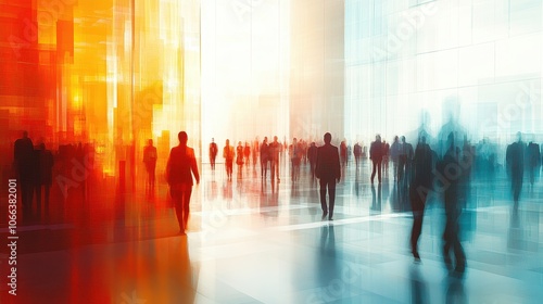 Abstract Silhouettes of People Walking in Modern Urban Environment with Vibrant Colors and Reflections