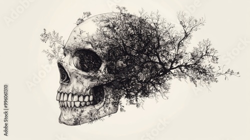 Abstract skull illustration created from trees and foliage in a hand drawn style