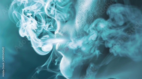 Abstract smoke swirls in blue and white, creating an ethereal and enigmatic portrait.
