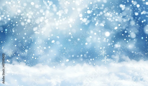 Abstract snow background with falling snowflakes and bokeh lights. Winter blizzard with light blue gradient sky. Christmas holiday