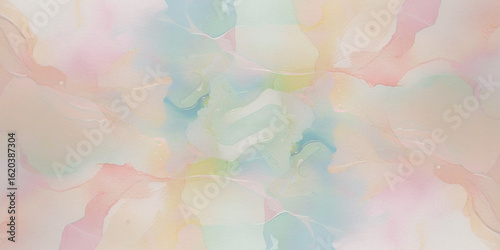 Abstract soft water color background with light pink, peach, yellow, and pale blue, with gentle gradients and fluid brushstrokes creating a dreamy, ethereal effect.