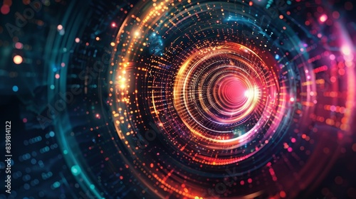 Abstract sound amplifying circle, intricate patterns, vibrant colors, modern, tech-inspired